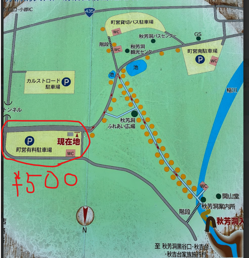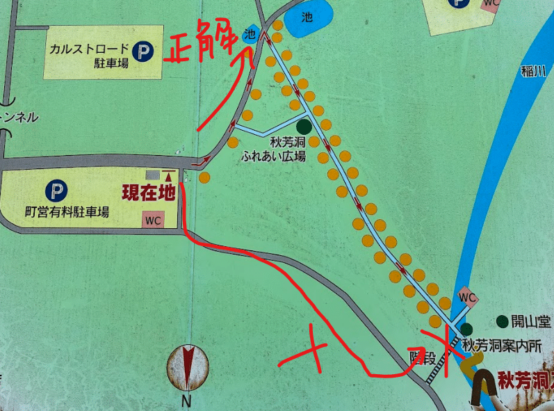 今回は正面入り口からの入り方のご紹介ですが、秋芳洞は違う入り口もあってそちらは無料で駐車することが可能です。山の上にあるルートとなります。