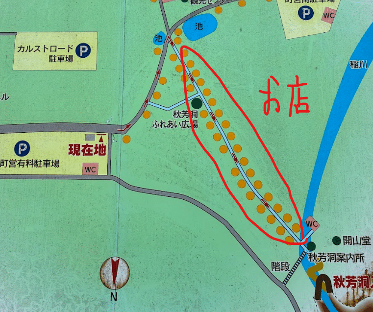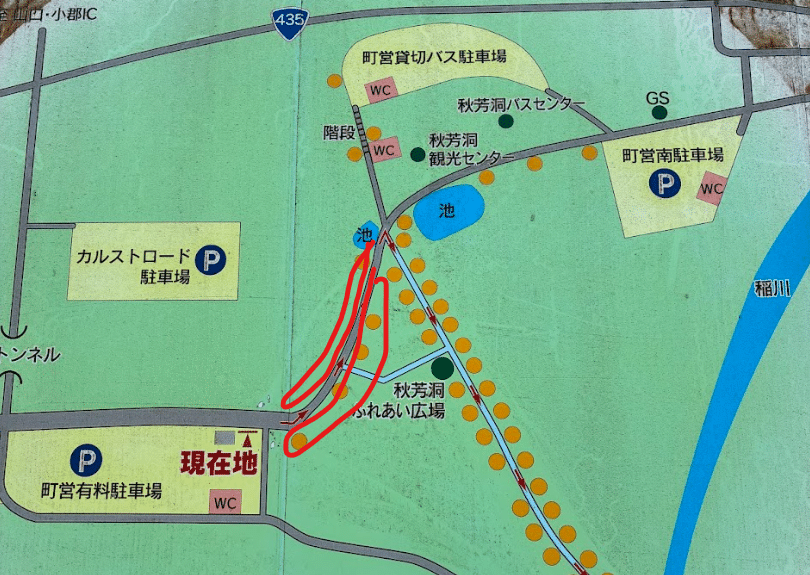 最初に案内した町営の駐車場から秋芳洞は結構歩く形となります。秋芳洞は全体を通して、歩く距離は長めなので歩きやすい靴が良いです。